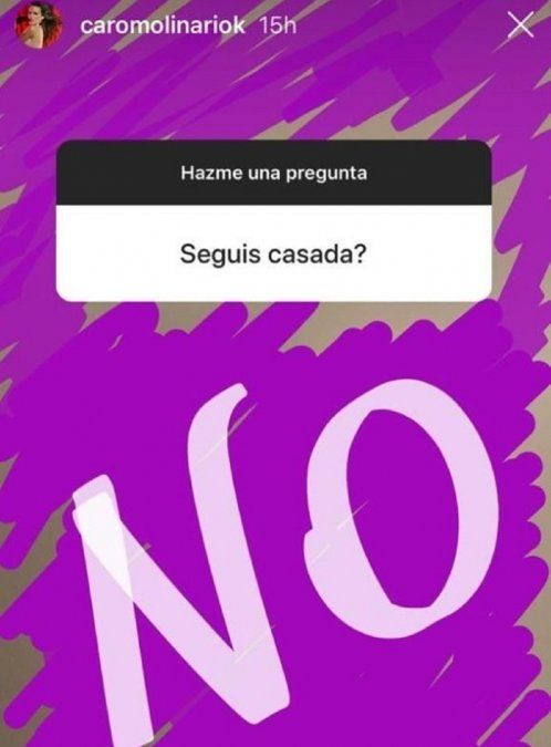 Mediante la dinámica de preguntas y respuestas de Instagram, Carolina Molinari pidió a sus seguidores que le hicieran consulta, y una de esas interrogantes fue: "¿Seguís casada?". La modelo, para sorpresa de muchos, dedicó una historia completa para contestar con un gran "no", confirmando así su separación con Mariano Pavone.