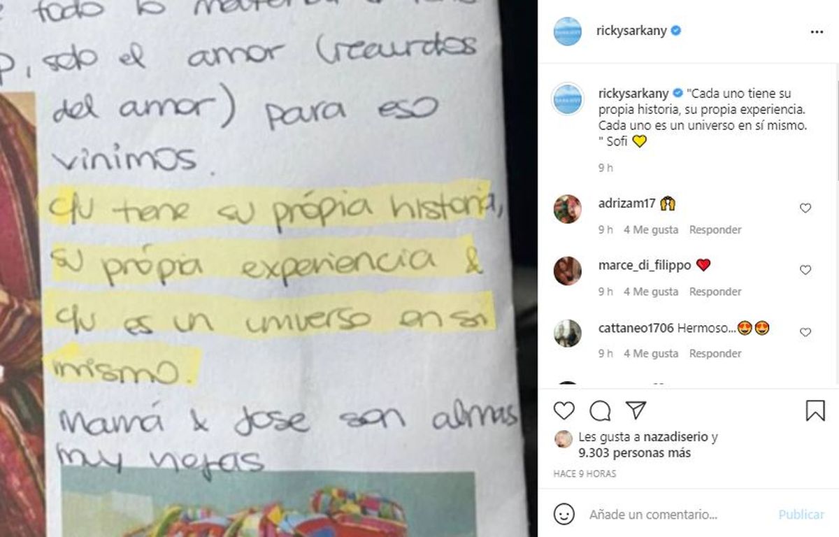 Poco después, Ricky Sarkany también compartió una foto donde se puede ver una nota escrita por su hija Sofía, en la que se podía leer lo siguiente: “Cada uno tiene su propia historia, su propia experiencia. Cada uno es un universo en sí mismo. Sofi”.