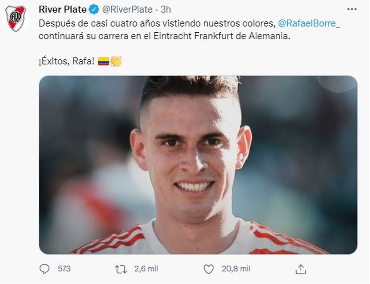 Obviamente, desde la entidad rojiblanca también se despidió al delantero colombiano. De hecho en las redes sociales de River Plate se puede leer el siguiente mensaje: “Después de casi cuatro años vistiendo nuestros colores, Rafael Santos Borré continuará su carrera en el Eintracht Frankfurt de Alemania ¡Éxitos, Rafa!”.