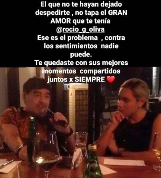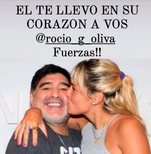 Ante esto, entristecida por la muerte de Diego, a través de sus historias de Instagram, Oliva hizo una serie de fuertes posteos que le enviaron amigos y seguidores, respaldando su relación de seis años con Maradona. “ El que no te hayan dejado despedirte no tapa el GRAM AMOR que te tenía. Ese es el problema, contra los sentimientos nadie puede. Te quedaste con sus mejores momentos compartidos juntos por siempre”, decía uno de ellos. Otro aseguraba de forma contundente: “Él te llevó en su corazón a vos ”.