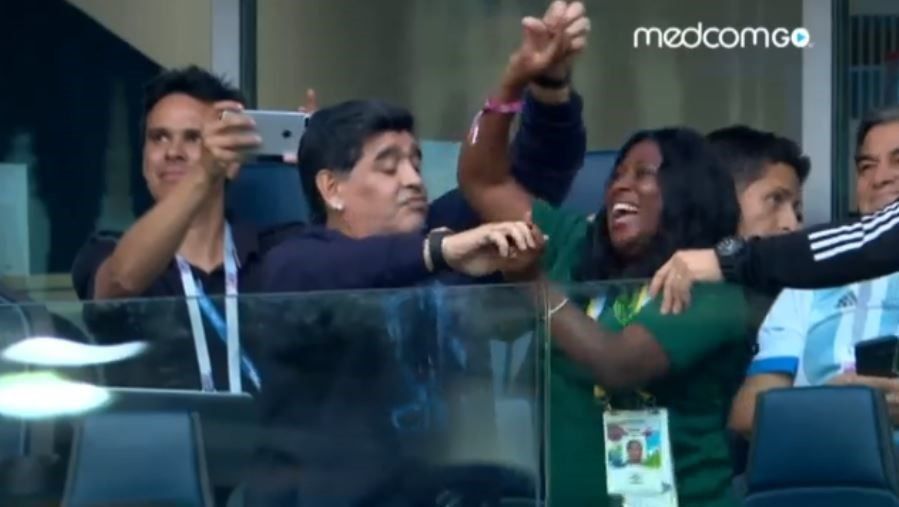 Sabemos que Maradona es un hincha ferviente y que sabe divertirse, más aun cuando está sin Rocío y esta no es la excepción ya que en estos momentos el Diez la esta pasando bomba bailando en el estadio con una voluptuosa nigeriana.