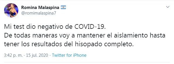 Romina Malaspina anunció a través de su cuenta en Twitter que su test de coronavirus le dio negativo pero aun así mantendrá el aislamiento preventivo. La conductora de Canal 26 se sometió al hisopado luego de asistir como invitada al programa "PH Podemos hablar" de telefe y tras que Andy Kusnetzoff develara su contagio.