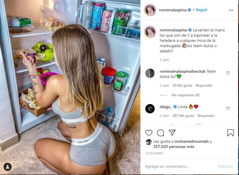 "Levanten la mano los que son de ir a bajonear a la heladera a cualquier hora de la madrugada. ¿Sos team dulce o salado?", le preguntó Malaspina a sus seguidores. En la foto se ve a la modelo de espalda comiendo una cucharada de torta. El posteo superó los 330.000 likes en menos de un día.