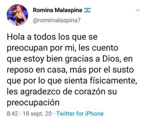 Luego de conocerse la noticia del accidente, Romina Malaspina se comunicó con sus fanáticos a través de su cuenta en la red social Twitter: “Hola. A todos los que se preocupan por mí, les cuento que estoy bien, gracias a Dios. En reposo en casa. Más por el susto que por lo que sienta físicamente. Les agradezco de corazón su preocupación”, escribió Malaspina.