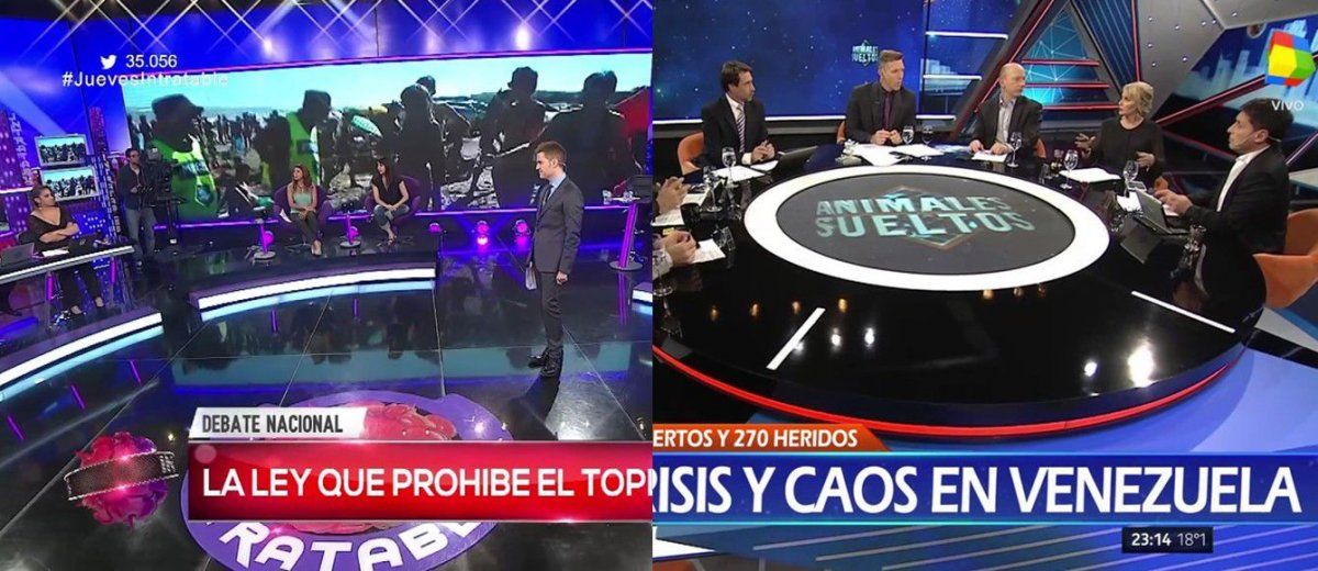 El central es "Intratables", el programa que comanda Santiago del Moro, quien anoche volvió a dejar en claro, como al pasar, un par de conceptos que bien pueden interpretarse como "palos" o "indirectas" a los dos ciclos que acompañan la noche del canal; en la previa el recién debutado "Polémica en el bar" y a su término "Animales sueltos" en versión de mesa de periodistas políticos que conduce Fantino.