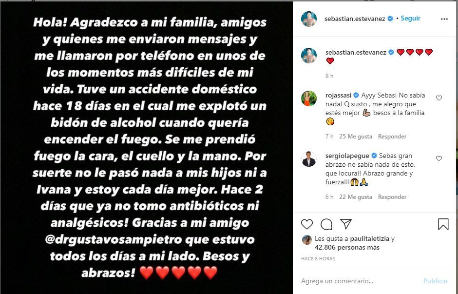 Luego Sebastián Estevanez explicó que fue lo que le pasó: “Tuve un accidente doméstico hace 18 días en el cual me explotó un bidón de alcohol cuando quería encender el fuego. Se me prendió fuego la cara, el cuello y la mano. Por suerte no le pasó nada a mis hijos ni a Ivana y estoy cada día mejor”.