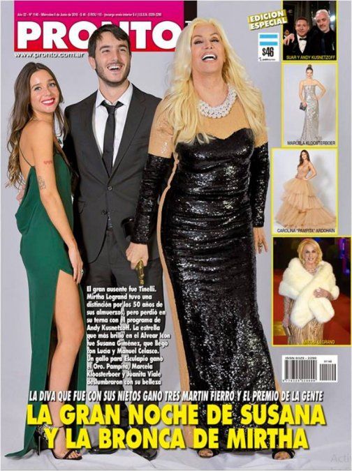 En Pronto titularon: "La gran noche de Susana y la bronca de Mirtha", haciendo referencia a la pérdida del premio contra el programa de Andy Kusnetzoff.