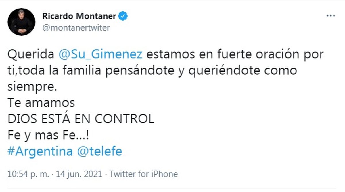 A través de su cuenta en Twitter, Ricardo Montaner dedicó un mensaje de apoyo a Susana Giménez, tras conocerse la noticia de que fue trasladada a terapia intermedia por complicaciones en su cuadro de coronavirus. Se conoció que la diva presentó baja saturación de oxígeno ante la neumonía unilateral que sufre en su pulmón izsquierdo.