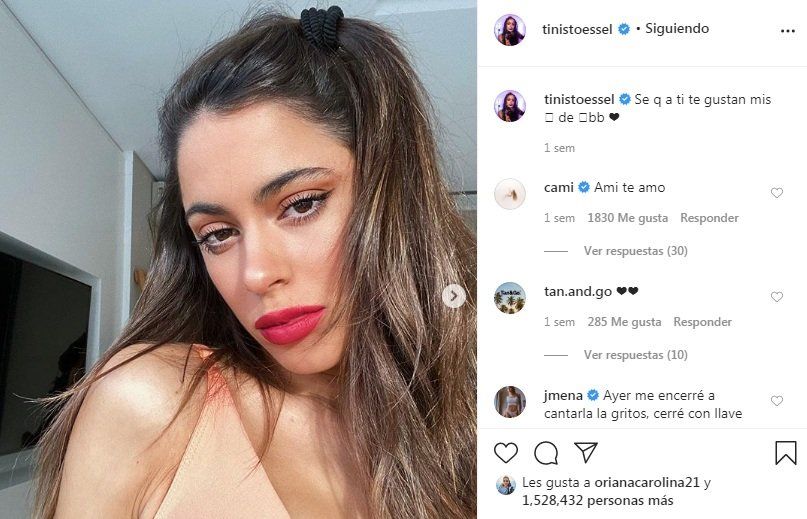 Tini Stoessel, publicó en su cuenta de Instagram una imagen con la descripción de un fragmento de su canción "Fresa" y recibió un comentario halagador de su amiga Jimena Barón. La cantante, se mostró con los labios color rojo, muy sensual y escribió: "Sé que a ti te gustan mis labios de fresa, bebé" y un emoji de corazón.