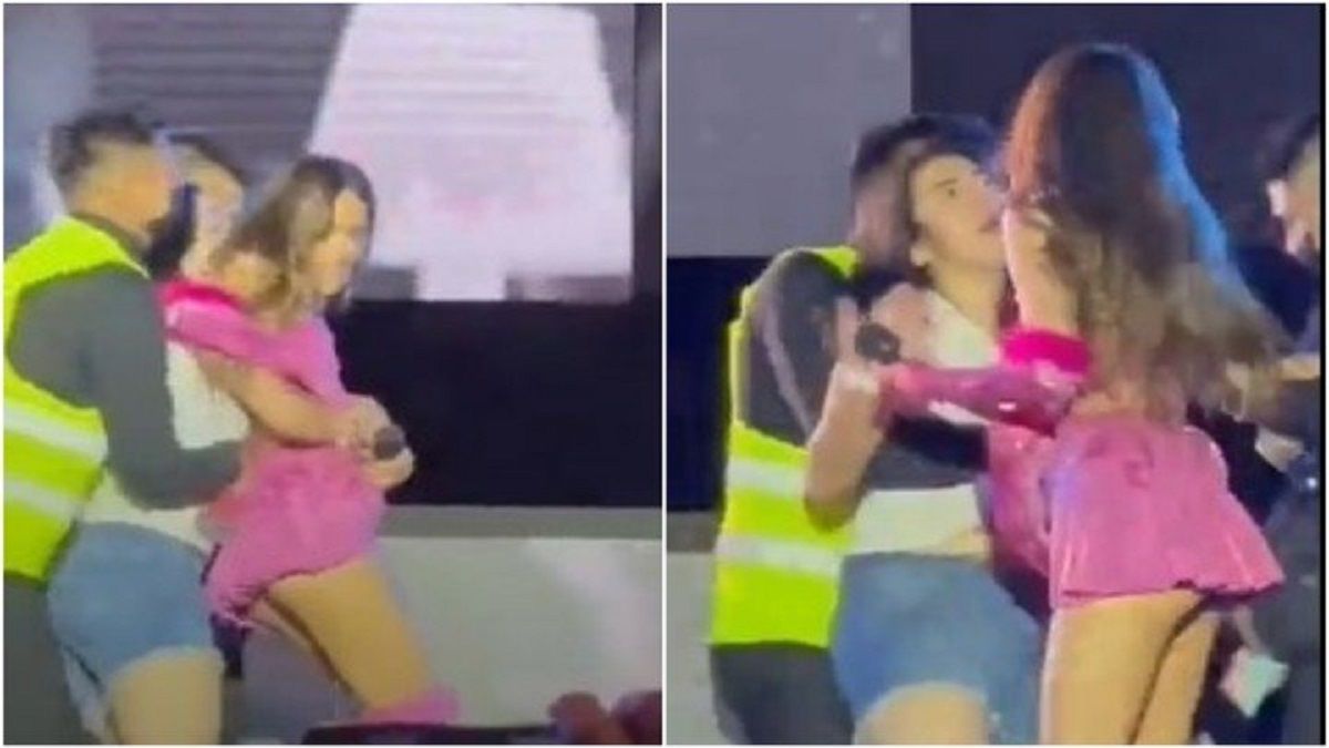 En medio de su presentación, la cantante vivió un inesperado momento que incluso contó con la presencia del personal de seguridad. Todo se dio mientras Tini interpretaba “Maldita Foto” -el tema que hizo a dúo con Manuel Turizo -, e inesperadamente una de sus seguidoras subió al escenario y la abrazó por la espalda, a la altura de la cintura.