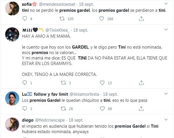 Más que nada fue a través de Twitter que los internautas dejaron saber su molestia. "Tini no se perdió le premios gardel, los premios gardel se perdieron a tini", "le cuento que hoy son los GARDEL, y le digo pero Tini no está nominada, esos premios no la valoran... Y mi mamá me dice: ES QUE TINI DA NO PARA ESTAR AHI, ELLA TIENE QUE ESTAR EN LOS GRAMMYS", fueron parte de los comentarios que se pueden leer.
