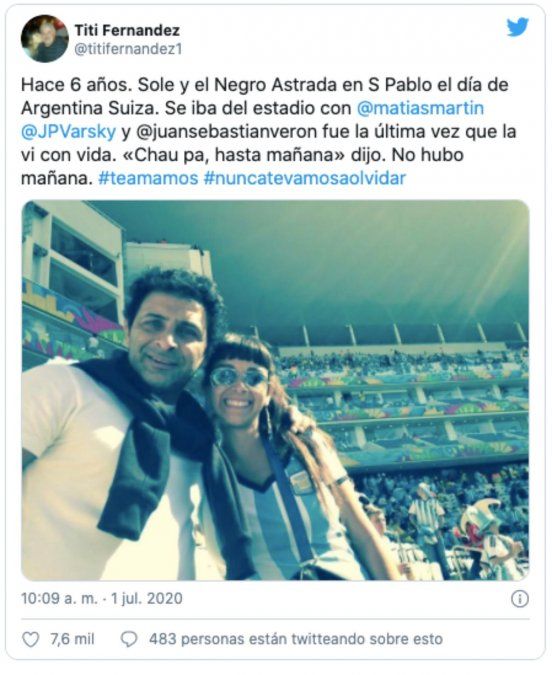 "Hace seis años. Sole y el Negro Astrada en San Pablo el día de Argentina - Suiza. Se iba del estadio con Matías Martin , Juan Pablo Varsky y Juan Sebastián Verón , fue la última vez que la vi con vida. 'Chau pa, hasta mañana', dijo. No hubo mañana. #teamamos #nuncatevamosaolvidar", escribió el periodista en su cuenta de Twitter.