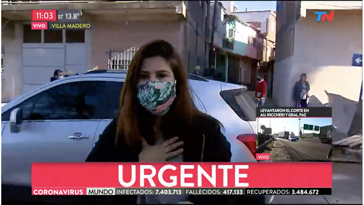 Insigna contó a TN que: "Estábamos parados, era imposible acceder. Por lo cual, decidimos con nuestros compañeros dejar los autos en la subida de la Ricchieri, en un terraplén, y subir caminando. Los camarógrafos me pasaron su ubicación porque llegaron antes. Yo llegué sola, intenté subir pero, cuando lo estaba haciendo, una persona se me vino encima para querer robarme, sacó un cuchillo y yo salí corriendo".