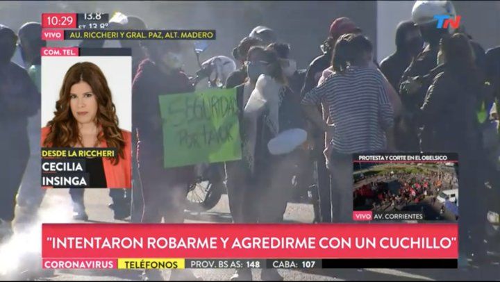 La periodista de TN Cecilia Insigna, sufrió un intento de asalto cuando cubría el corte parcial de la Autopista Riccheri y General Paz. Según relató un hombre de campera negra salió de entre unos autos y la corrió con un cuchillo, afortunadamente un camionero salió a ayudarla.