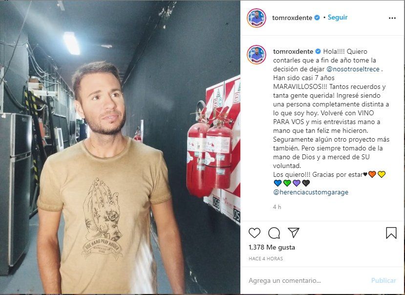 El periodista hizo oficial su renuncia a través de las redes sociales. Tomás Dente escribió a través de sus cuentas en Instagram y Twitter el siguiente mensaje: “¡¡¡Hola a todos!!! Quería contarles que tomé la decisión a fin de año de dejar @NosotrosElTrece. HAN SIDO 7 AÑOS MARAVILLOSOS. ¡Volveré con mis entrevistas mano a mano que tan feliz me hicieron! Siempre tomado de la mano de Dios y a merced de su voluntad. Gracias por estar”, escribió Dente.