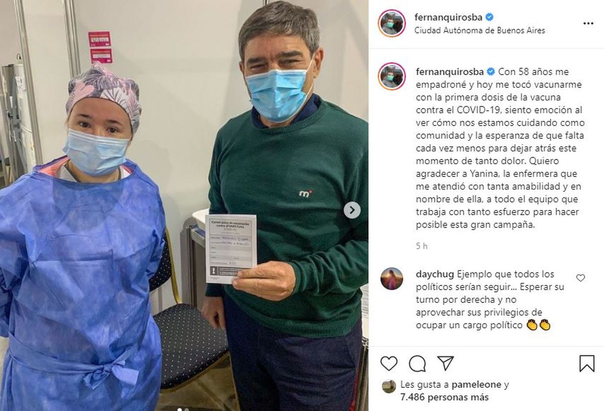 El día de hoy el ministro de salud porteño Fernán Quirós de 58 años fue inoculado con la primera dosis de la vacuna contra el Covid 19. Así lo informó Quirós a través de una fotografía en la red social Instagram. Quirós fue incluido en el grupo etario que se vacunó esta semana.