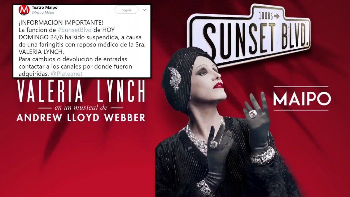 Anoche se suspendió la función de Sunset Boulevard, el musical que protagoniza Valeria Lynch en el teatro Maipo. El espectáculo, éxito indiscutido de la crítica, que unánimemente le ha puesto la calificación "Excelente", gran candidato a arrasar con los premios ACE de este año, está en sus últimas semanas en cartel.