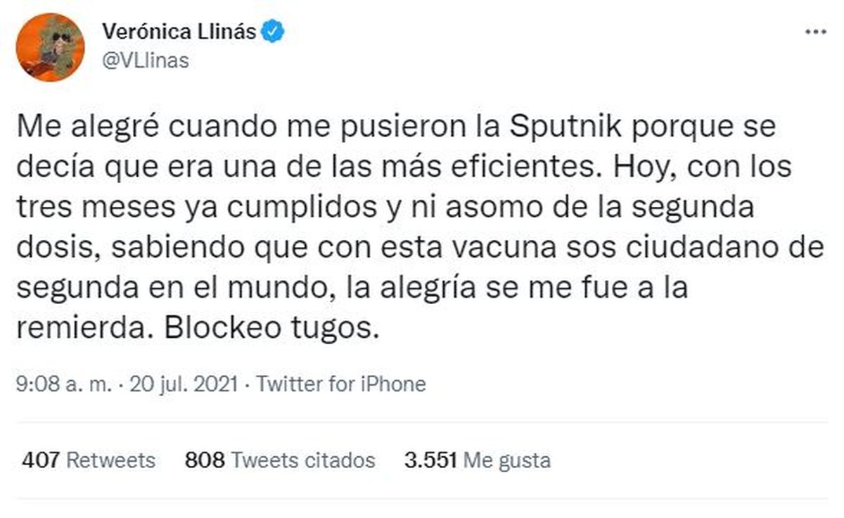 “Me alegré cuando me pusieron la Sputnik porque se decía que era una de las más eficientes. Hoy, con los tres meses ya cumplidos y ni asomo de la segunda dosis, sabiendo que con esta vacuna sos ciudadano de segunda en el mundo, la alegría se me fue a la rem... Bloqueo tugos”, escribió Verónica Llinás a través de su perfil en Twitter.