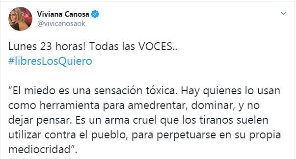 A través de su cuenta en Twitter, tras conocerse la lamentable noticia, escribió: "¡El miedo paraliza y dinamita la libertad!", lo cual causó indignación y los comentarios en rechazo a esto de sus seguidores."Te quiero presa! Que vergüenza @canal9oficial tendría que actuar algún fiscal de oficio! Esta mujer no puede seguir frente a una cámara", "Tóxico es el cloruro de sodio también", "El dióxido de cloro no es una sensación Viviana, es tóxico !!! Ojalá demuestres humanidad y tengas unas palabras sobre el tema el lunes", fueron algunos.