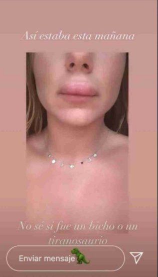 La joven Icardi detalló lo que sucedió: “Quiero contar esta breve historia de mi triste vida que me pasó justamente hoy que es mi último día en Canarias. Como verán tengo el labio de arriba que parezco la veneno, porque un maldito bicho, y que no es mi marido, me picó creo que en la noche“.