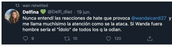 Nara usó un tuit de una de sus seguidoras en defensa a dichos comentarios: "Nunca entendí las reacciones de hate (odio) que provoca Wanda. Y me llama muchísimo la atención cómo se la ataca. Si Wanda fuera hombre sería el 'Ídolo' de todos los que la odian", fue la defensa a la que la pareja de Mauro Icardi le hizo retweet.