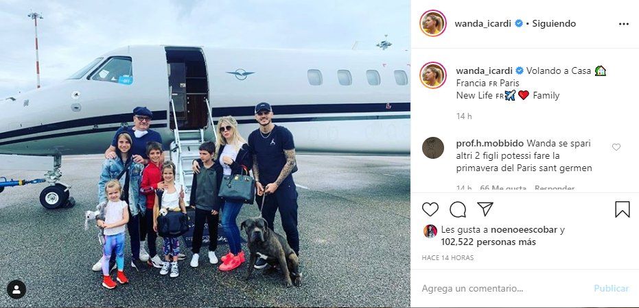 “Volando a casa. Francia, París. New Life. Family”, escribió Wanda Nara, junto a un posteo con un avión privado de fondo y su familia Valentino (11), Francesca (5), Benedicto (8), Isabella (3) y Constantino (9), su marido con un perro y el papá de Mauro.