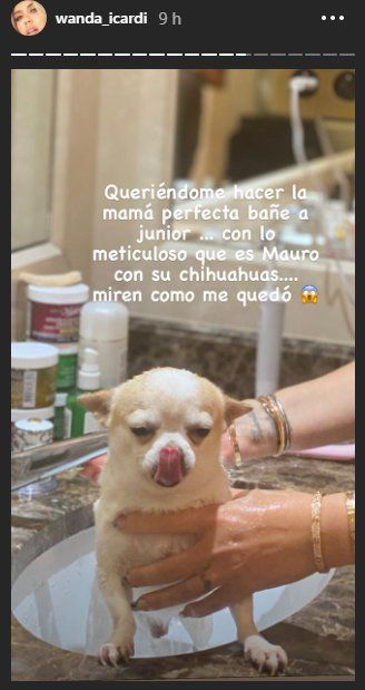 Wanda Nara posteo a sus fanáticos en redes sociales una foto junto al perrito y con el mensaje: “Queriéndome hacer la mamá perfecta, bañé a Junior". Sin embargo, consideró que algo hizo mal y el pelo de su mascota no quedó tan bien como Nara quería. Pero no hay un dato menor: “Con lo meticuloso que es Mauro con sus chihuahuas...”, sentenció sobre el particular interés del futbolista con sus mascotas.