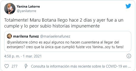 El episodio entre Yanina Latorre y Maru Botana inició cuando una seguidora consultó en la red social del pajarito, por qué algunos famosos no cumplían con la cuarentena obligatoria cuando regresaban de sus viajes fuera del país: “Creo que la única que cumplió fuiste vos, Yanina. ¡Soy tu fan!”. Le escribió la admiradora, aplaudiendo que Latorre fue la única que cumplió con la medida al regresar de Miami.