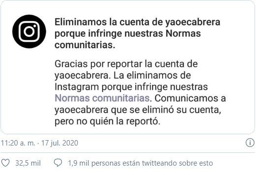Instagram explicó que la suspensión de la cuenta de Yao Cabrera obedece a que "infringe normas comunitarias", y se tomó la decisión de sacarla de circulación luego de muchas denuncias.